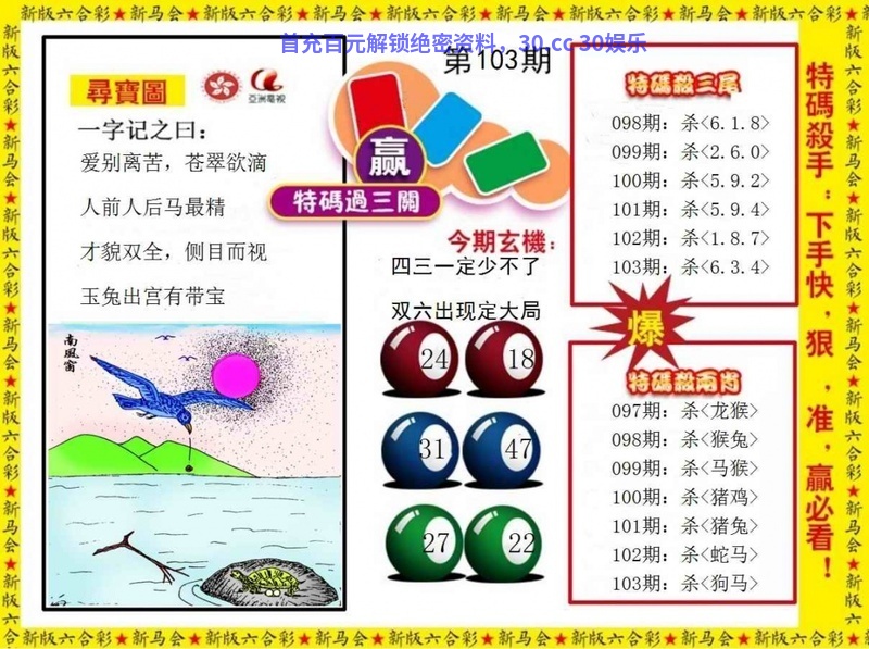 103期:九肖[羊狗兔鸡猪猴龙马鼠]开:牛41